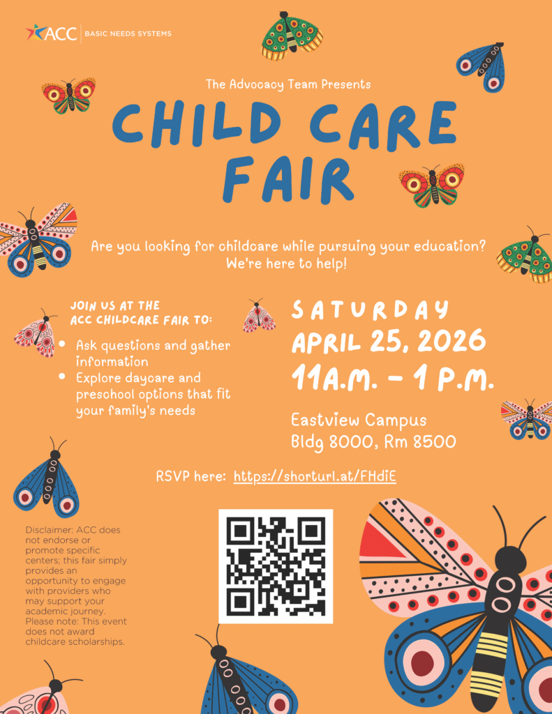Childcare Scholarship-> Help in navigating college and community childcare assistance options including the Advocacy Team scholarship, ACC Children’s Lab School and other community childcare resources.
