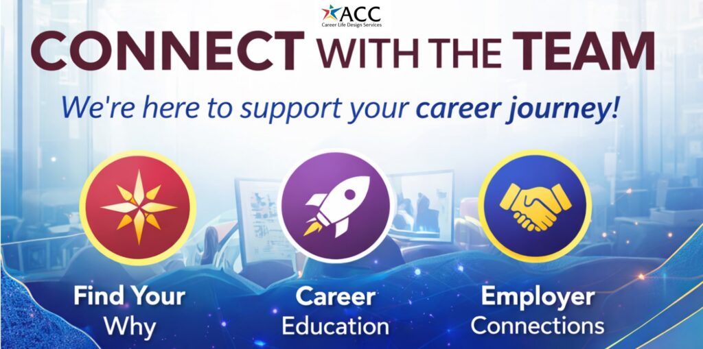Career Life Design Services helps ACC students explore career pathways, develop career readiness skills, and connect with employers. Our Career Specialists provide personalized guidance to help you move from college to career.