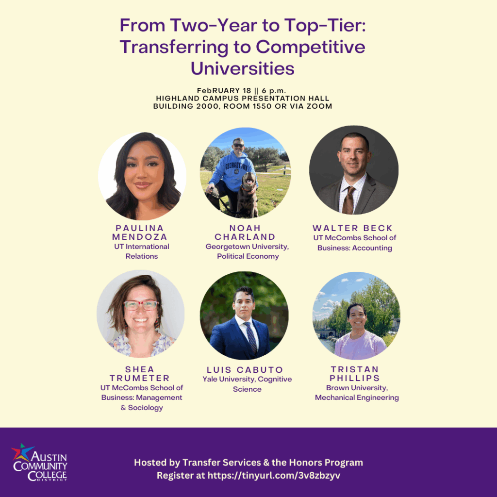 Join us for a wide-ranging discussion of transfer tips, scholarships, and more! Light refreshments provided. Register here. Attending remotely? Zoom registration is here. For questions, contact [email protected]