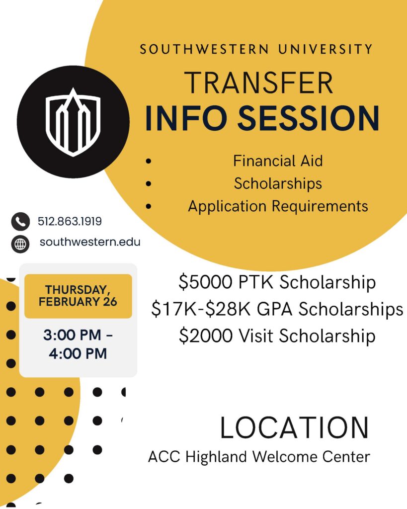 Come learn about Southwestern University and what it has to offer ACC Honors Program students! This is your chance to ask questions, explore opportunities, and learn about financial aid/scholarships. Assistant Director of Transfer Admissions Jake Harp will be on hand to tell you all about the transfer pathways at this highly regarded private liberal arts university just up the road in Georgetown.