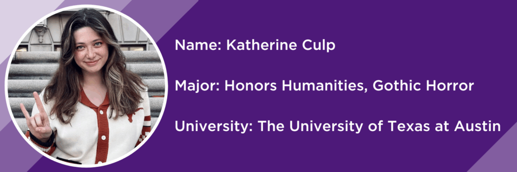 What are your future goals? I hope to author my own horror stories someday. I have been researching the genre so much over the past year and a half, and I have such a deeper understanding of my interests and what actually terrifies me. Writing a thesis on vampires may be one of the most fun, frustrating, and best experiences I have ever had in school.